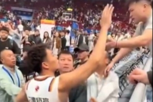 比赛结束后,场边发生了一个小插曲,上海男篮球员李添荣想和场边的球迷击掌互动,但是遭到北京主场工作人员的拦截。